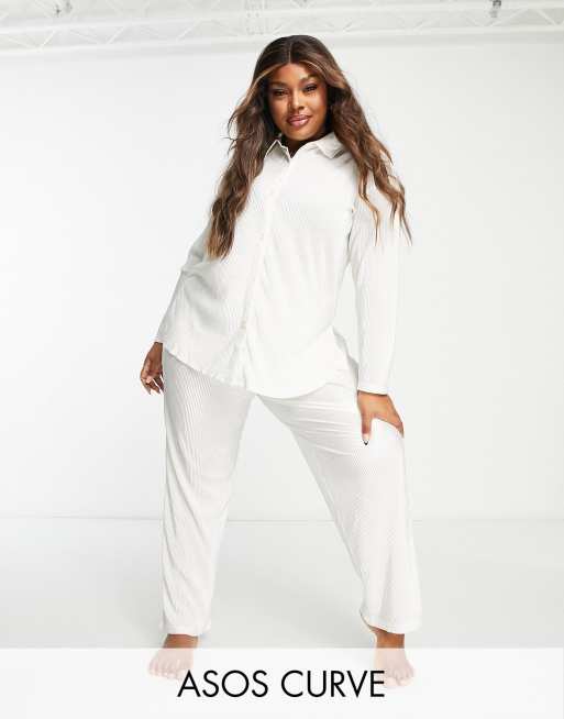 ASOS DESIGN Curve lounge plisse shirt & pants set in white
