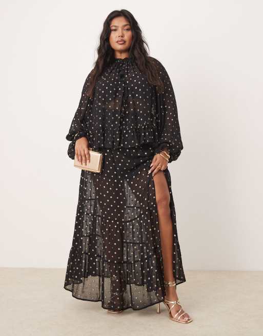 ASOS DESIGN Curve metallic spot maxi skirt in black & gold