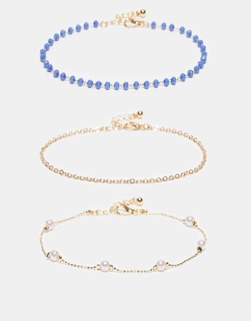 ASOS DESIGN Curve multipack of anklets with blue beads and faux pearls in gold tone