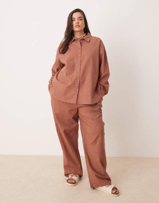 ASOS DESIGN Curve oversized linen shirt and pull-on pants set in mocha