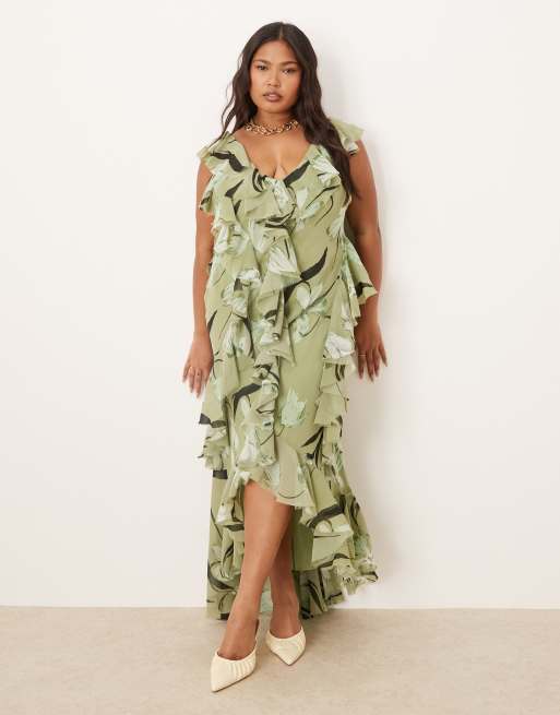ASOS DESIGN Curve ruffle bias cut maxi dress with open back in green floral