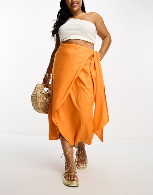 ASOS DESIGN Curve sarong wrap midi skirt in orange