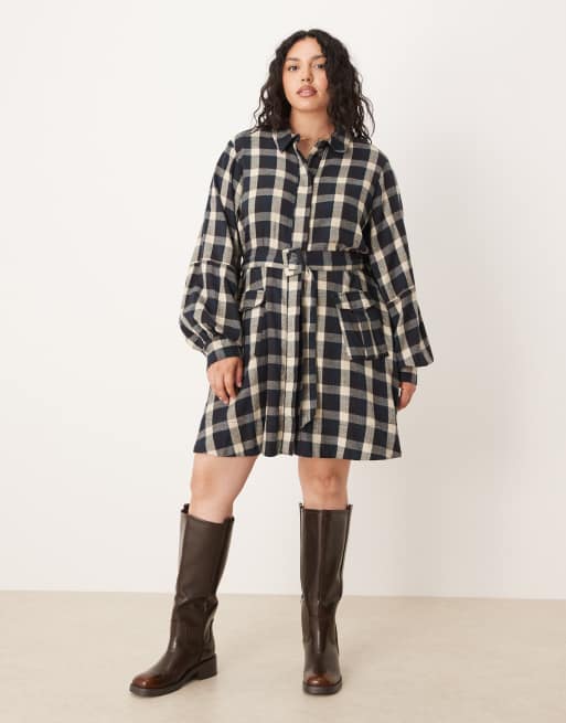 ASOS DESIGN Curve shirt mini dress with belt in black and tan plaid