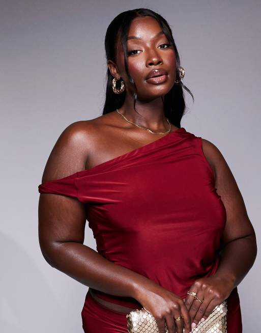 ASOS DESIGN Curve slinky twist off shoulder top in burgundy - part of a set