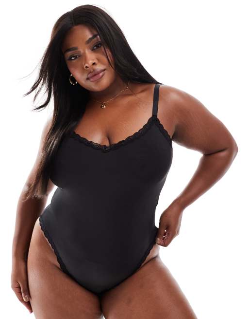 ASOS DESIGN Curve Tia super soft microfiber soft bodysuit with lace trim in black