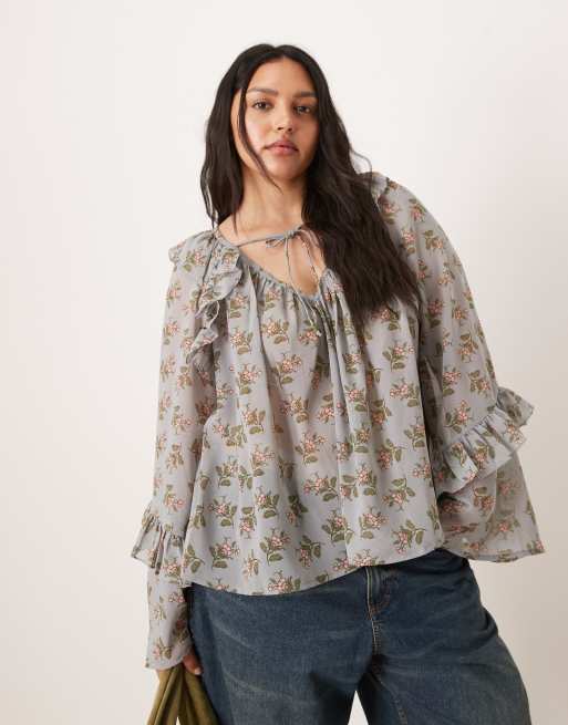 ASOS DESIGN Curve tie neck smock top with flared sleeves in floral print