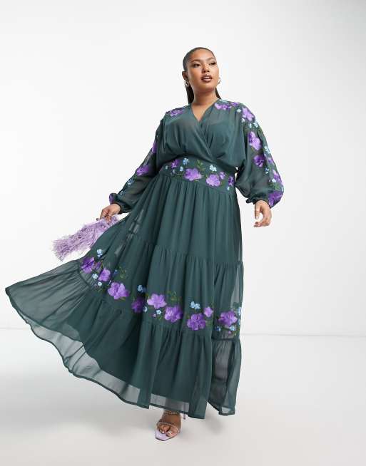 ASOS DESIGN Curve v neck batwing chiffon maxi dress with embroidery detail in pine green