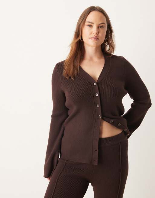 ASOS DESIGN Curve v-neck ribbed cardigan in chocolate - part of a set