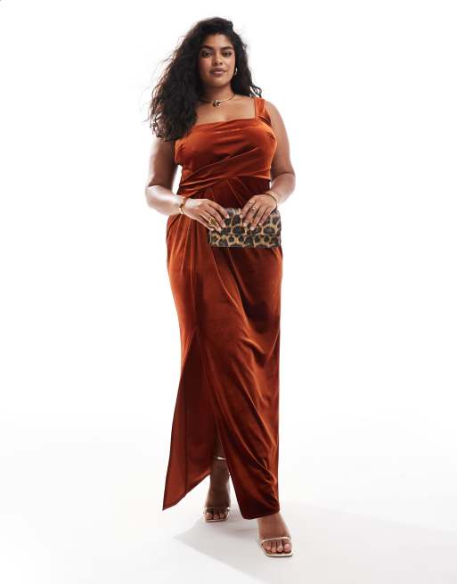 ASOS DESIGN Curve velvet square neck maxi dress with drape skirt in rust