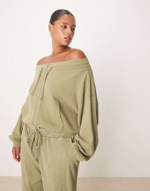 ASOS DESIGN Curve waffle knit off the shoulder zip up sweatshirt in khaki green