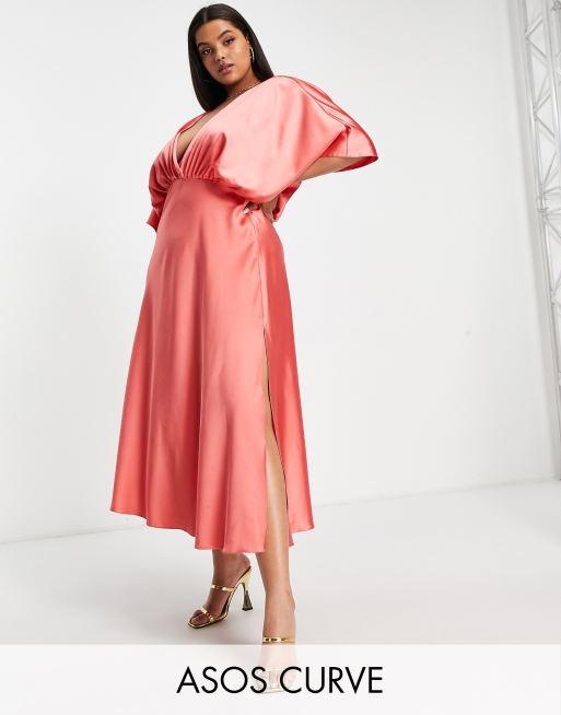 ASOS DESIGN Curve wrap front batwing sleeve satin midi dress in coral
