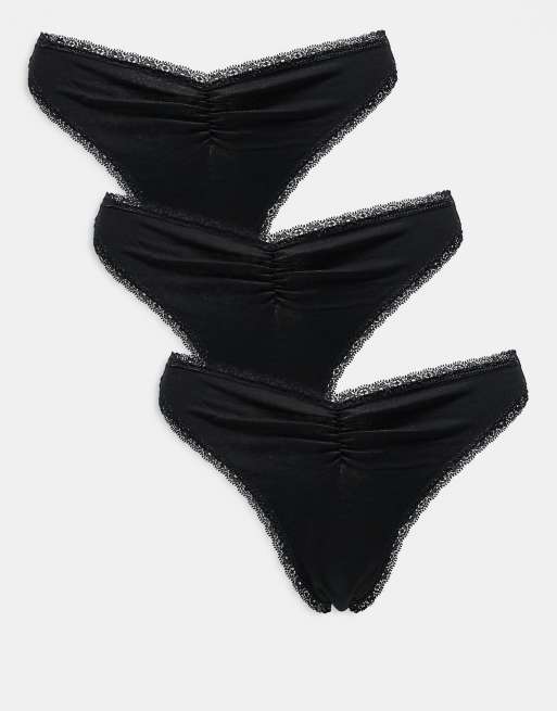 ASOS DESIGN Libby 3 pack high leg thong with ruched front detail in black