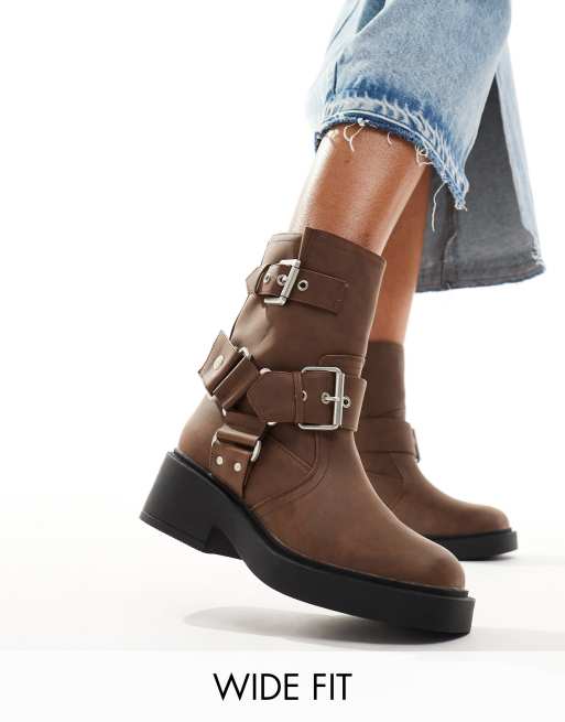 ASOS DESIGN Wide Fit Aim harness biker ankle boots in brown