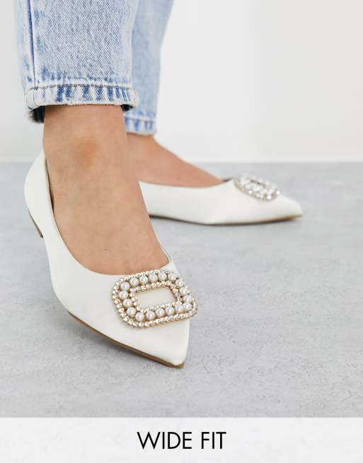 ASOS DESIGN Wide Fit Laura embellished pointed ballet flats in ivory satin