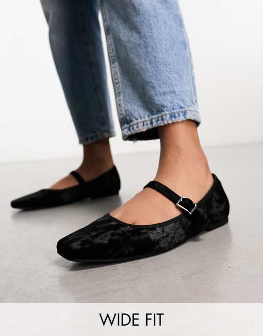 ASOS DESIGN Wide Fit League velvet Mary jane ballet flats in black