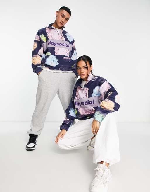 ASOS Day Social unisex quarter zip sweatshirt in all over print polar fleece with logo panel in navy