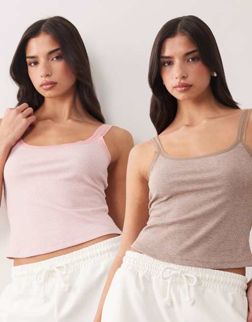 ASOS DESIGN 2 pack cami pajama tops with mesh trim in pink & chocolate