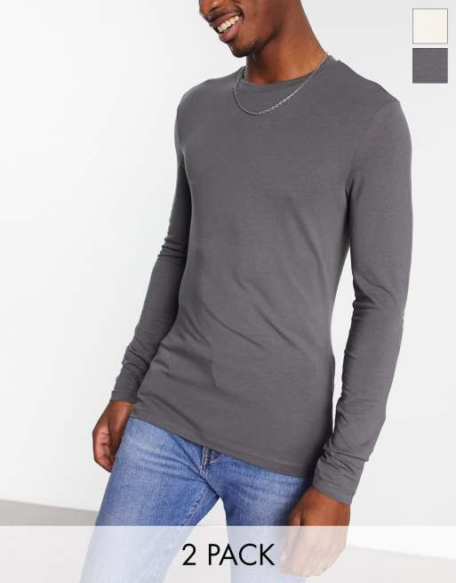 ASOS DESIGN 2 pack long sleeve muscle t-shirt in gray and cream