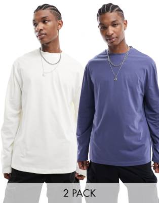 ASOS DESIGN 2 pack long sleeve t-shirt in ecru and blue