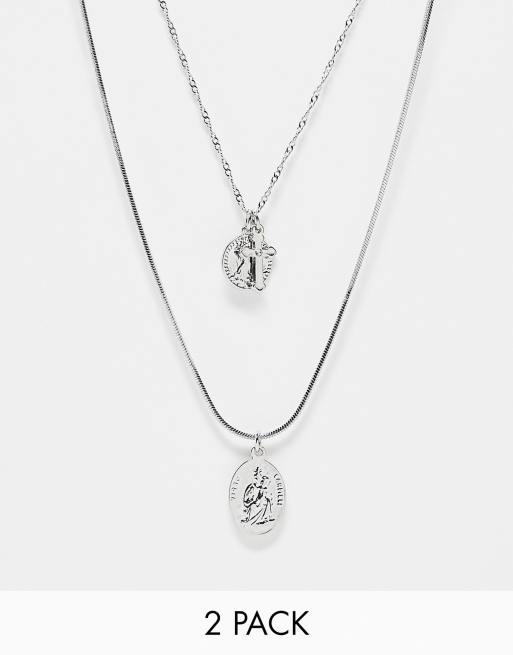ASOS DESIGN 2 pack necklace with cross and St Christopher pendant in silver tone