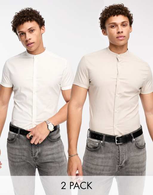 ASOS DESIGN 2 pack skinny shirt with band collar in white/taupe