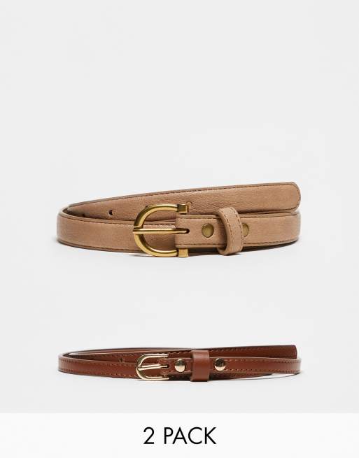 ASOS DESIGN 2 pack skinny waist and hip jeans belts in tan and beige