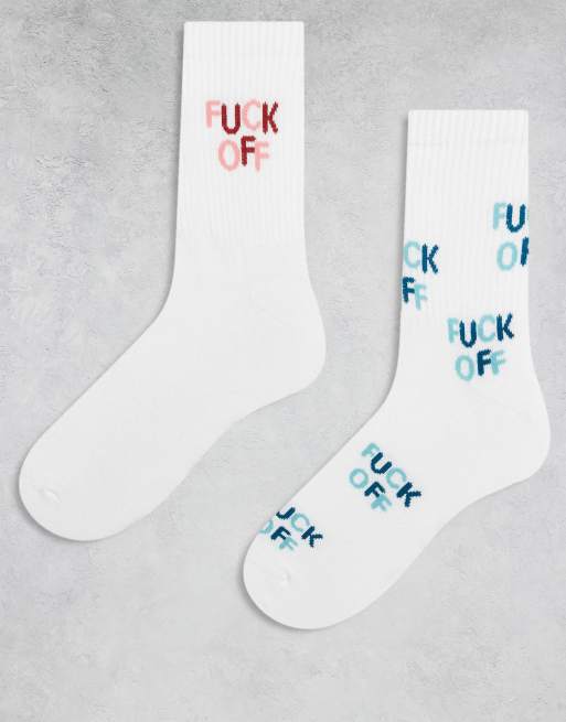 ASOS DESIGN 2 pack socks with swear word graphic in white