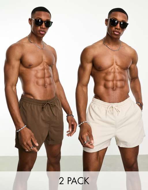 ASOS DESIGN 2 pack swim shorts in short length in brown and beige