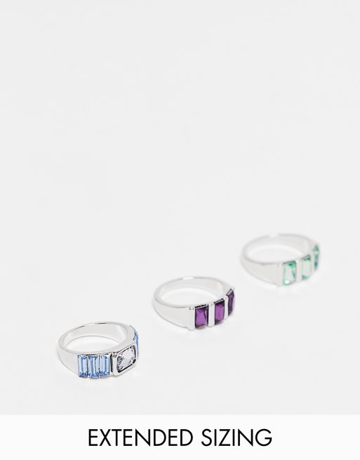 ASOS DESIGN 3 pack baguette ring set with multicolor crystals in silver tone