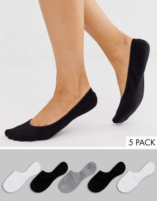 ASOS DESIGN 5 pack invisible socks with back grip band detail in black white and gray