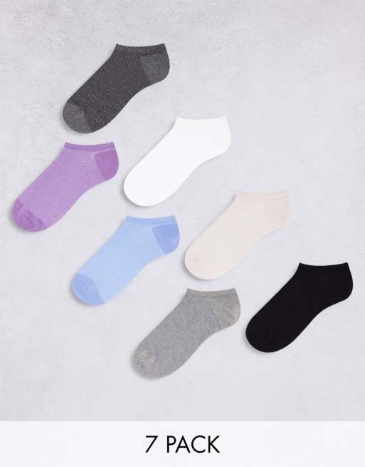 ASOS DESIGN 7 pack waffle texture sneaker socks in purple, blue and monochrome tones