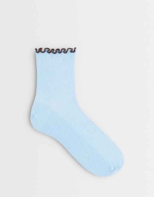 ASOS DESIGN ankle socks with contrast ruffle trim in light blue with brown trim