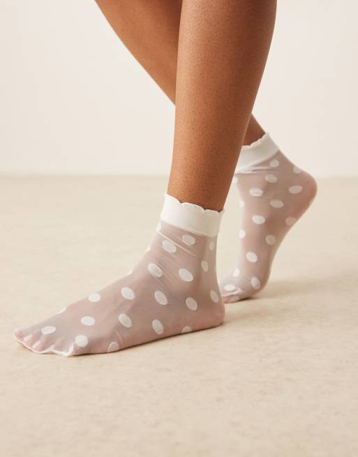 ASOS DESIGN ankle socks with frill top in white sheer polka dots