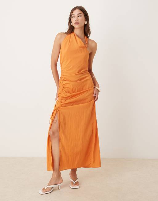 ASOS DESIGN asymmetric midi dress with ruched side channel in orange