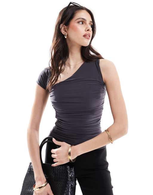 ASOS DESIGN asymmetric neck one shoulder top in gray