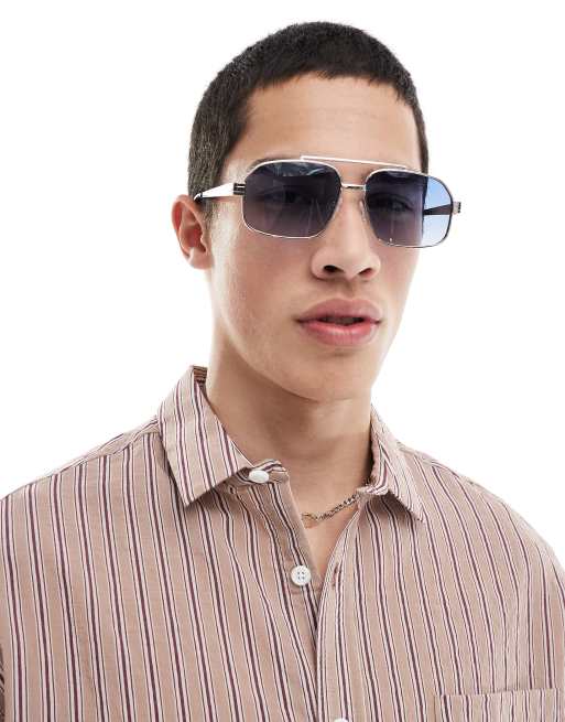 ASOS DESIGN aviator sunglasses with blue lenses and silver tone metal frames