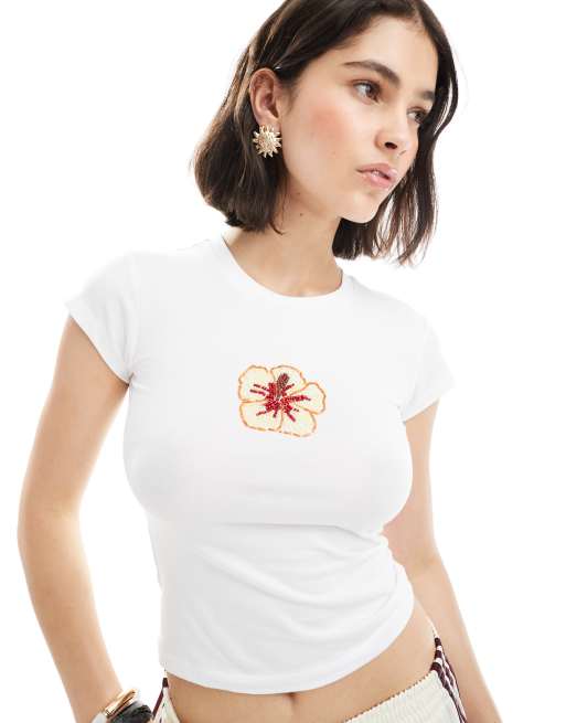 ASOS DESIGN baby tee with beaded hibiscus graphic in ivory