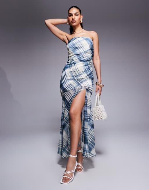 ASOS DESIGN bandeau chiffon maxi dress in blue plaid