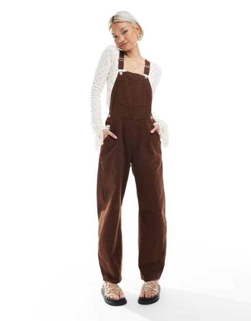 ASOS DESIGN barrel leg denim overalls in brown