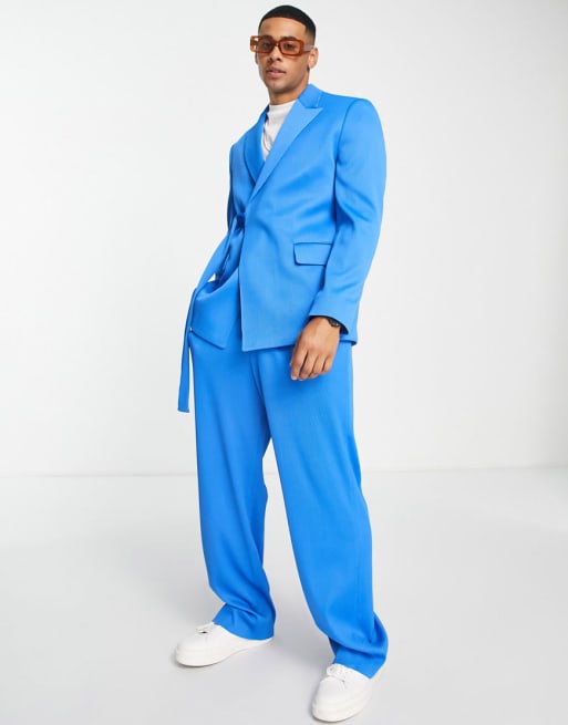 ASOS DESIGN belted suit in electric blue plisse