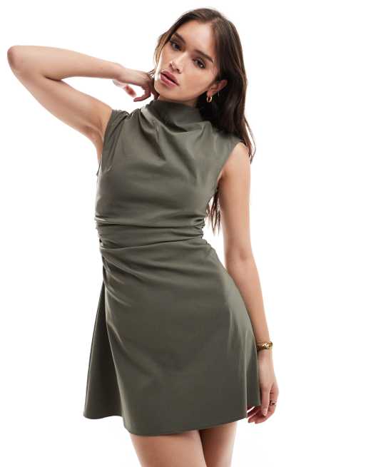 ASOS DESIGN bengaline high neck sleeveless mini dress with ruching detail in olive