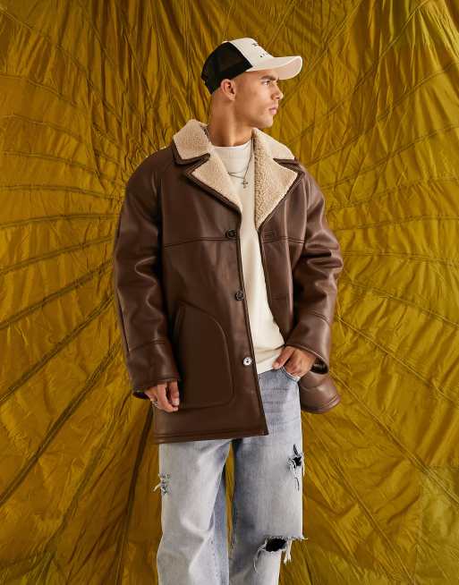 ASOS DESIGN borg dellboy jacket in brown with contrast collar
