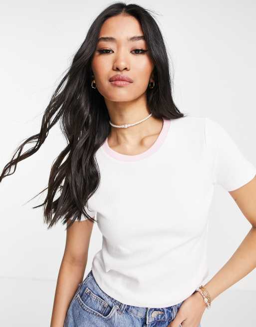 ASOS DESIGN boxy crop ribbed tee with contrast binding in white and pink