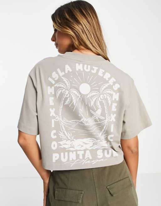 ASOS DESIGN boxy cut off t-shirt with Isla mejas graphic print in washed sand