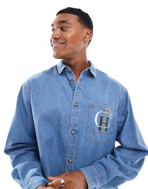 ASOS DESIGN boxy oversized denim shirt with chest embroidery in mid blue