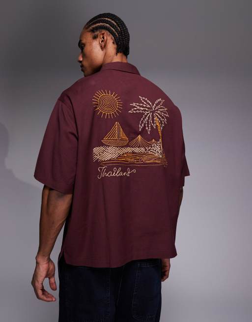 ASOS DESIGN boxy oversized shirt with back embroidery in burgundy