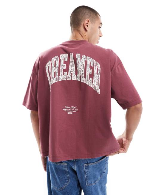 ASOS DESIGN boxy oversized t-shirt with back print in burgundy
