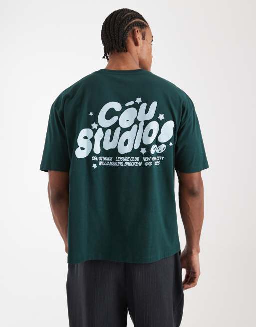 ASOS DESIGN boxy oversized t-shirt with céu studios graphic in dark green