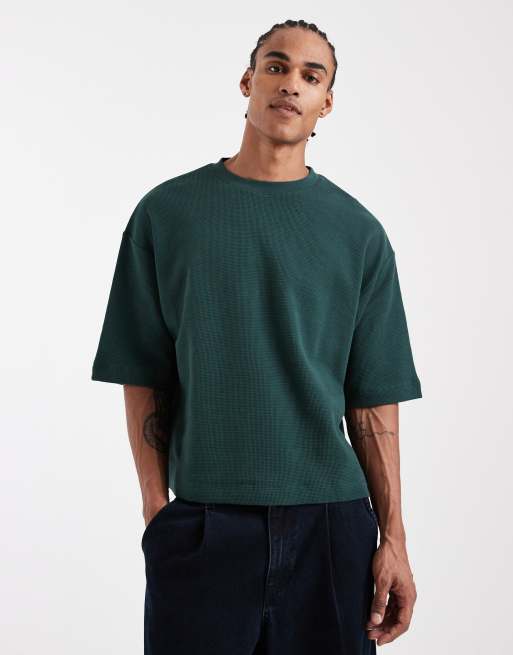 ASOS DESIGN boxy oversized T-shirt with half sleeve in dark green waffle