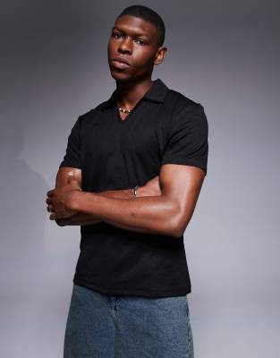 ASOS DESIGN boxy polo shirt with deep neckline in black texture